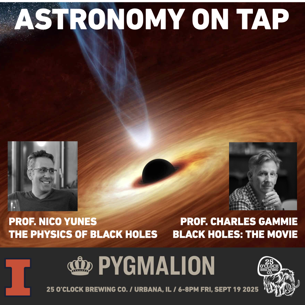 Astronomy on Tap will have three speakers from the U. Illinois Astronomy Department talking about smoke in space, super massive black holes, and astrophysics from the South Pole.